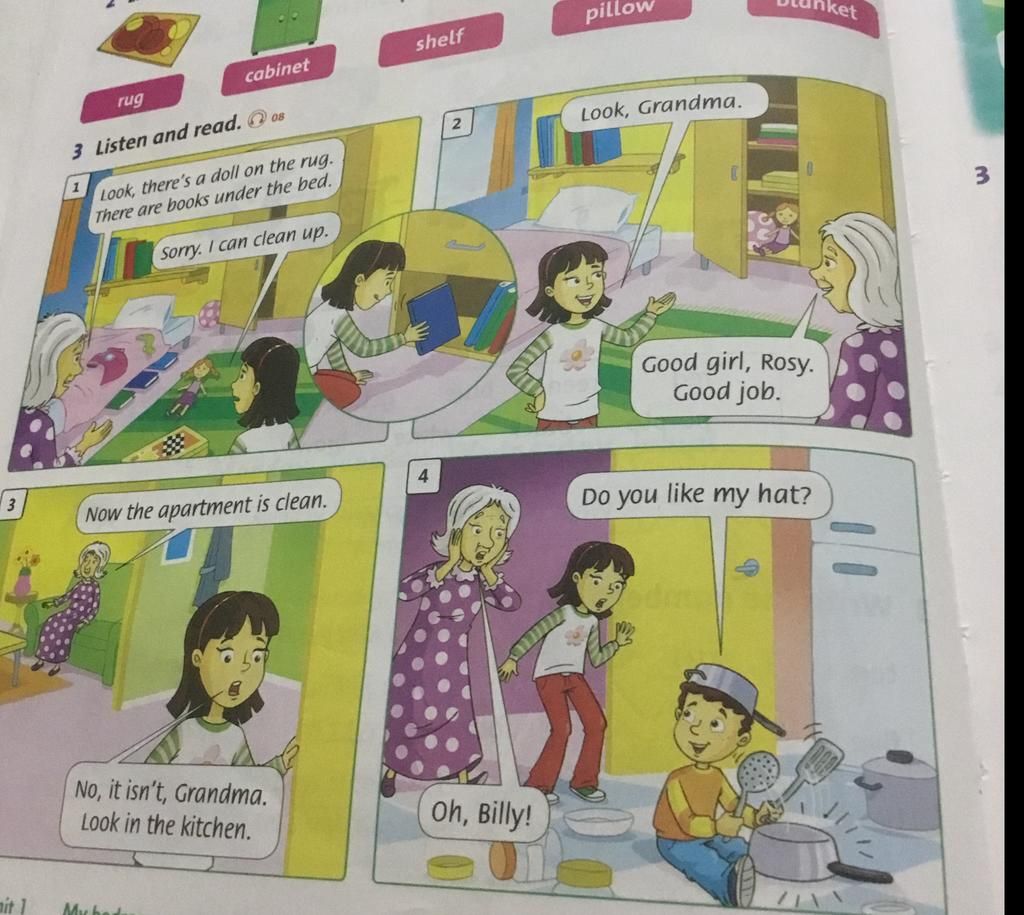 Dịch: Nhìn này cháu, có một con búp bê trên tấm thảm. Có những cuốn sách dưới chiếc giường.