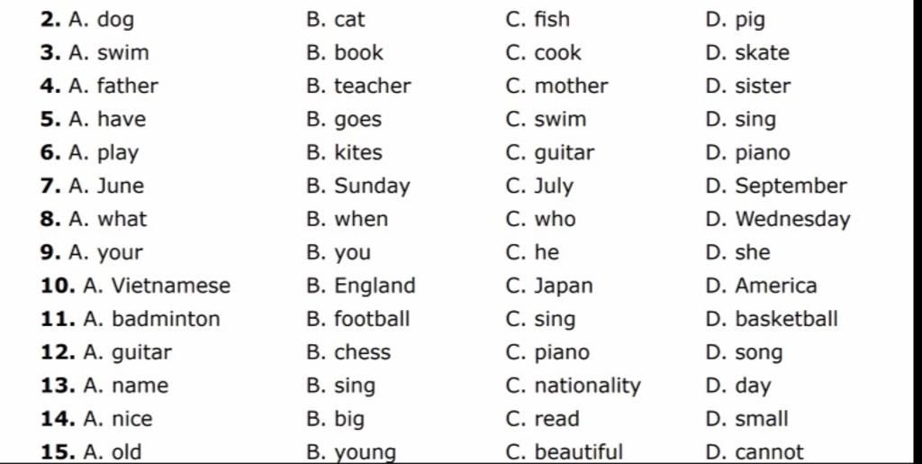 1. C, vì fish là động vật dưới nước, còn lại là động vật trên cạn.