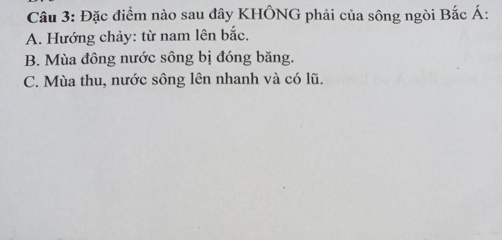 Câu 3 đặc điểm nào sau đây ko phải của sông ngòi Bắc Á ?. Đáp án : C mùa thu nước sông lên nhanh và có lũ. Lời giải đáp án A và B ko phải là của sông ngòi Bắc Á lên nếu chọn lọc thì còn đáp án C