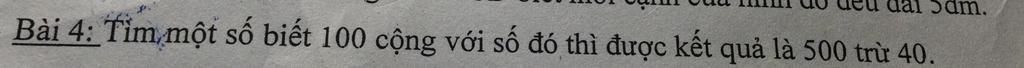 Đề : Tìm một số biết 100 cộng với số đó thì được kết quả là 500 trừ 40