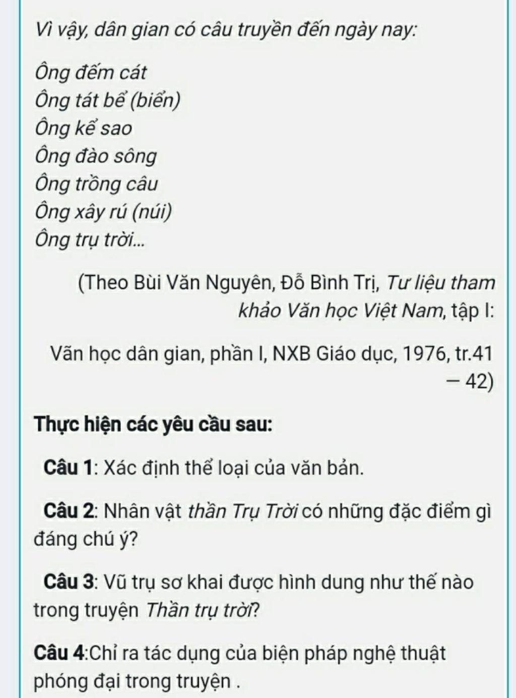 4/ Biện pháp phóng đại phản ánh quan niệm của người thời cổ về nguồn gốc thế giới và đời sống, từ đó thể hiện khát khao chịn phục thiên nhiên của con người.