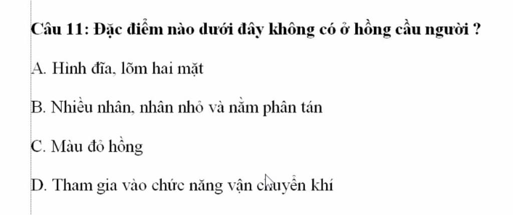 Hồng cầu có hình đĩa, lõm hai mặt, màu đỏ hồng, tham gia vào chứ năng vận chuyển khí và không có nhân.
