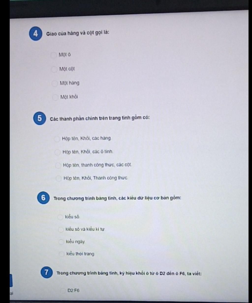 6. Trong chương trình bảng tính gồm các kiểu dữ liệu cơ bản là: