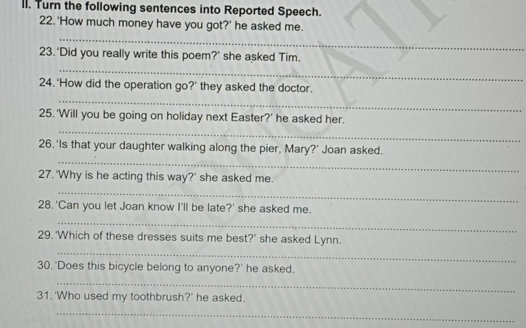 - Câu hỏi Wh: S + asked + Wh question + S + V.