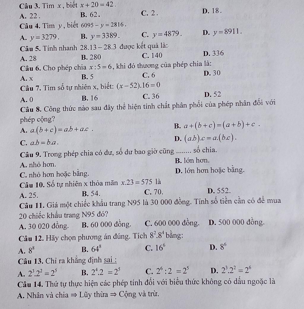 8.Công thức nào thể hiện tính chất phân phối của phép nhân đối với phép công? (Chọn A)