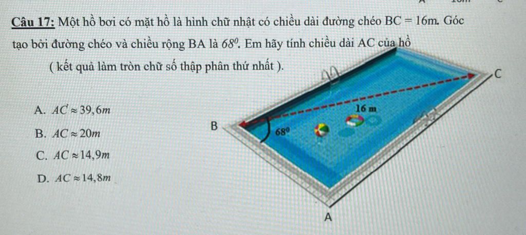 Câu 17: Một hồ bơi có mặt hồ là hình chữ nhật có chiều dài đường chéo BC = 16m. Góc