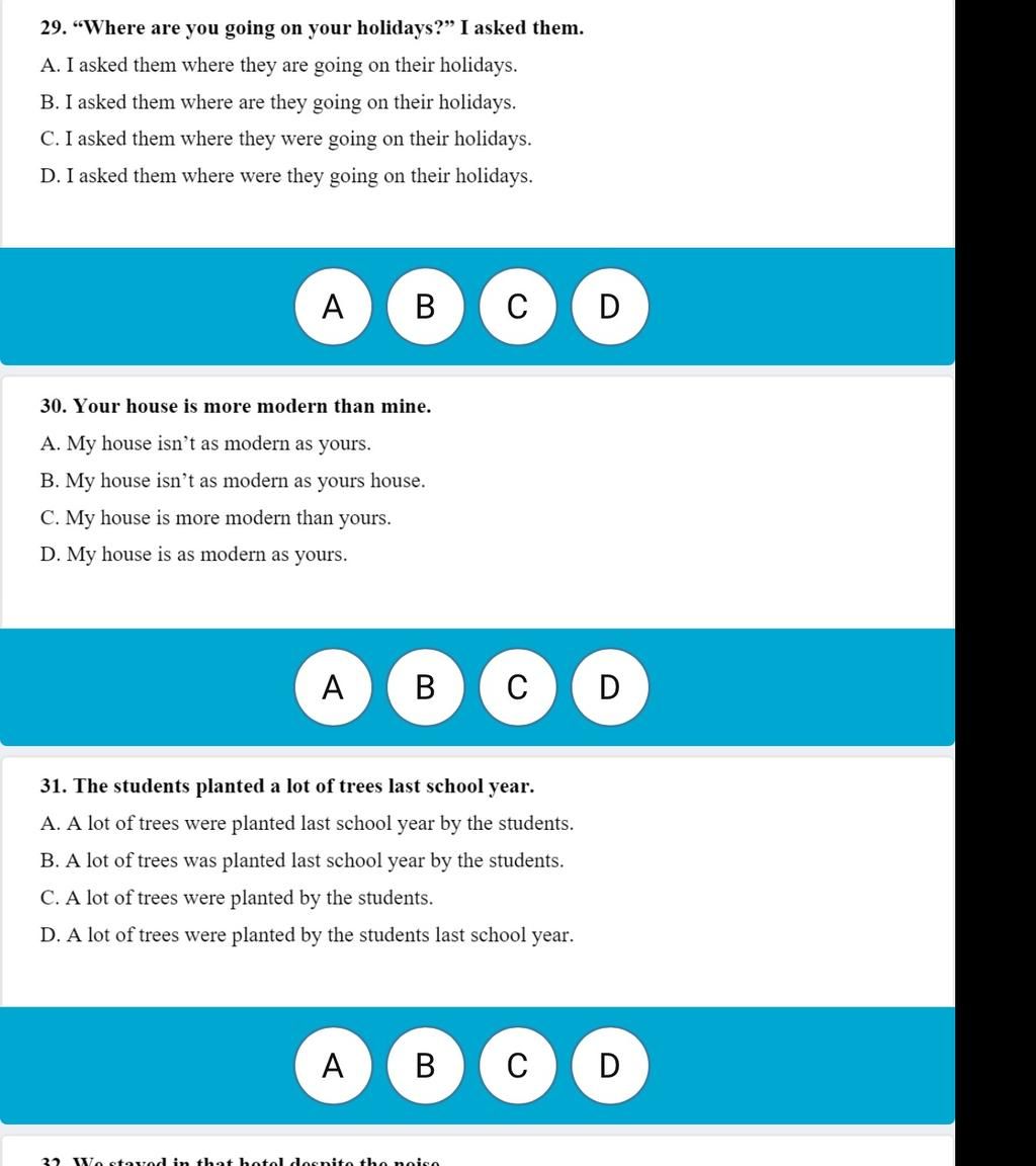( So sánh bằng : S + V + as + adj/adv + as + S2/... ) 31. D
