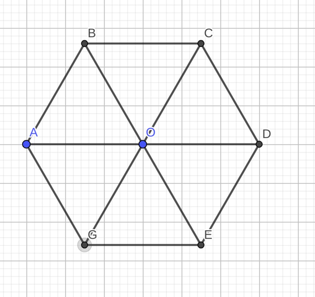 Ta có $ABCDEG$ là lục giác đều, $AD, CG, BE$ giao nhau tại $O$