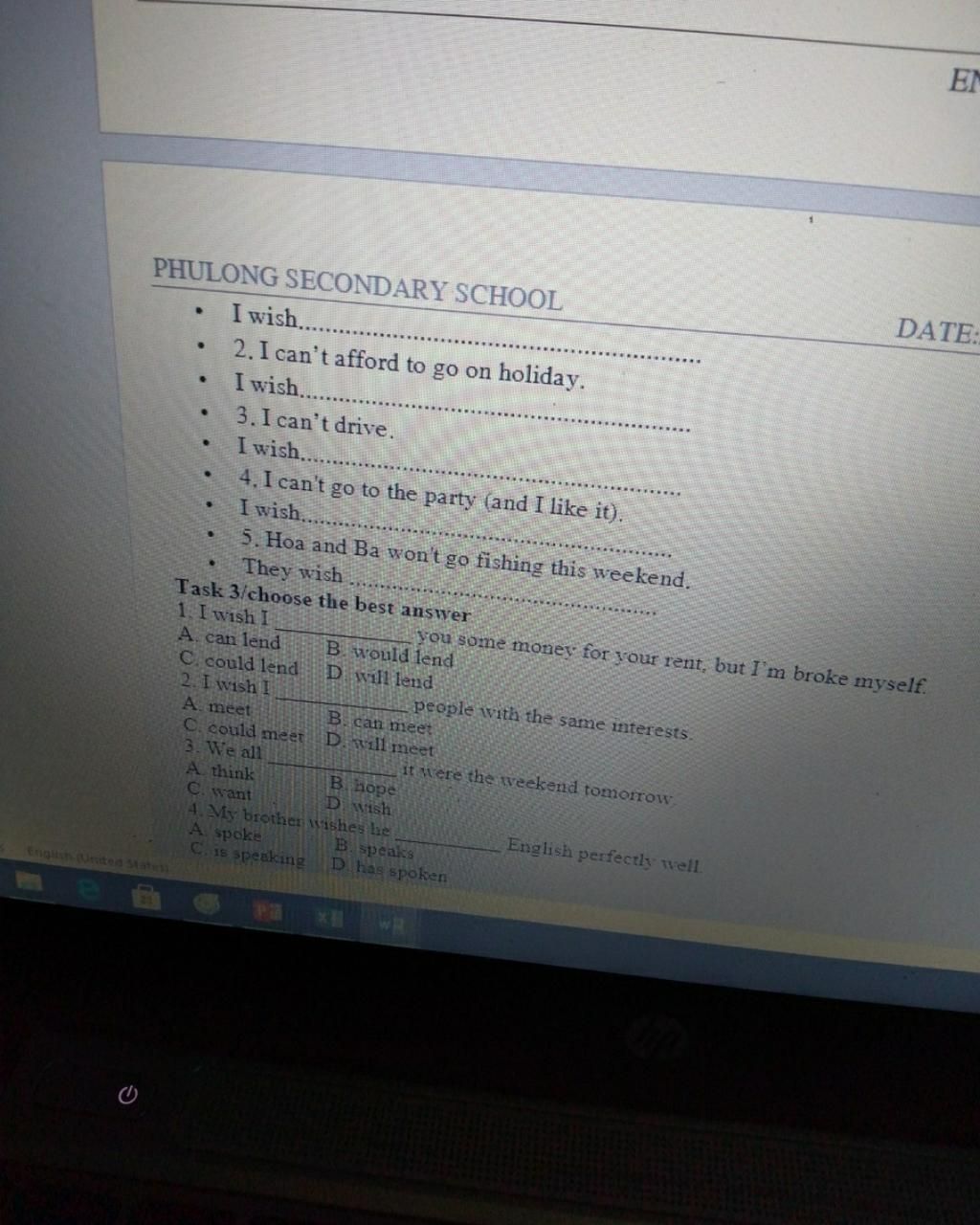 (ước 1 sự việc ở tương lai: S+wish+S2+would V)