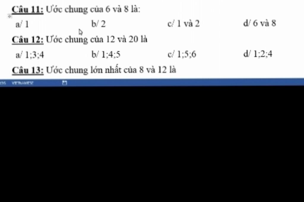 ⇒ƯCLN(8;12)= $2^2$ = 4 ( mình không thấy đáp án nên không biết chọn câu nào, bạn chọn đáp án nào là 4 nhé! )