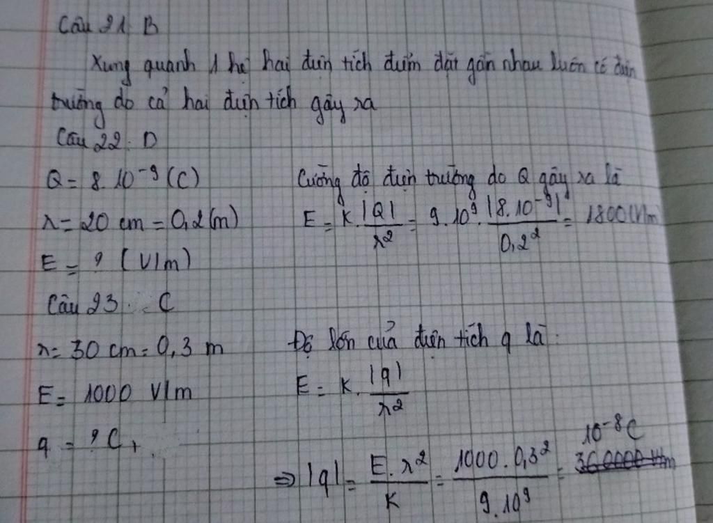 Câu 23: Một điện tích điểm dương Q trong chân không gây ra tại điểm M cách điện tích một khoảng r = 30cm, một điện trường có cường độ E = 1000V/m. Độ lớn điện tích Q là: