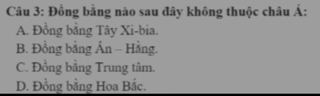 ⇒Giải thích: Đồng bằng Trung tâm thuộc Bắc Mĩ. Còn 3 đồng bằng: Tây Xi-bia, Ấn –Hằng, Hoa Bắc đều thuộc châu Á.