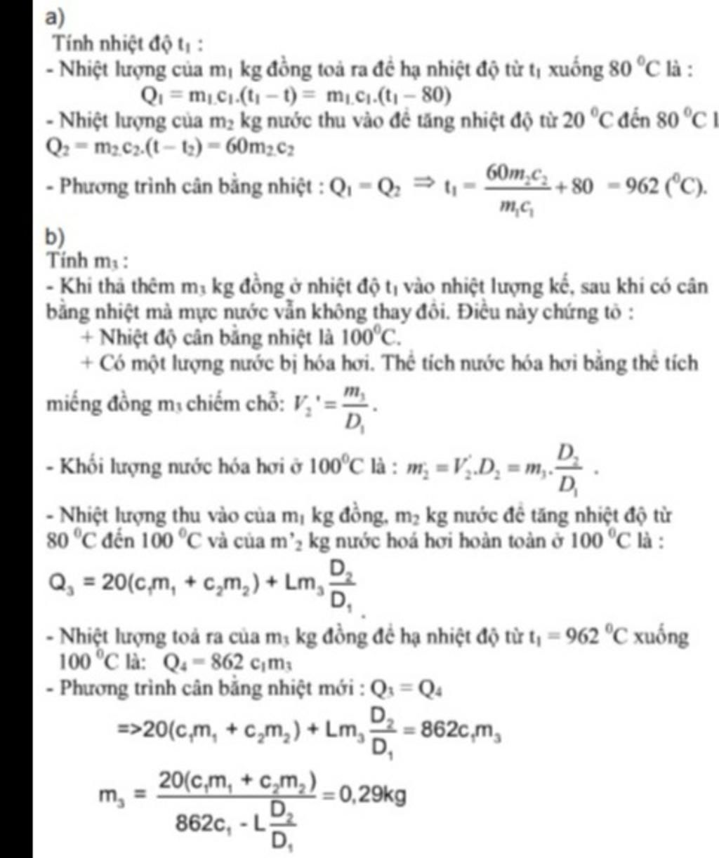 2. Khi thả thêm $m_{3}$ ở $t_{1}$ vào nhiệt lượng kế, sau khi CBN mà mực nước vẫn không thay đổi, chứng tỏ nước bị hóa hơi 1 phần và nhiệt độ cuối cùng của NLK là `100^o` C và thể tích phần nước hóa hơi bằng thể tích miếng đồng $m_{3}$ và bằng: V = `m_{3}/D_{1}`