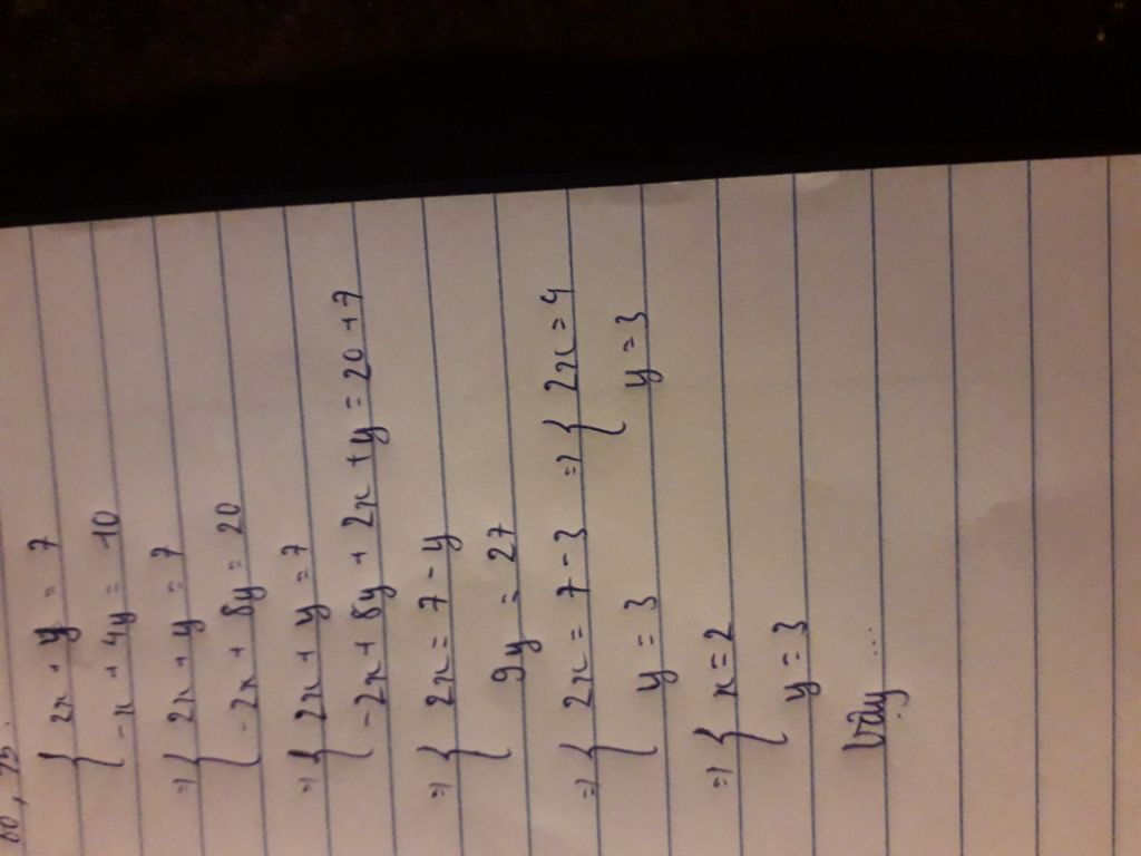 $\Leftrightarrow \left\{\begin{matrix}2x + y = 7\\ -2x + 8y = 20\end{matrix}\right.$