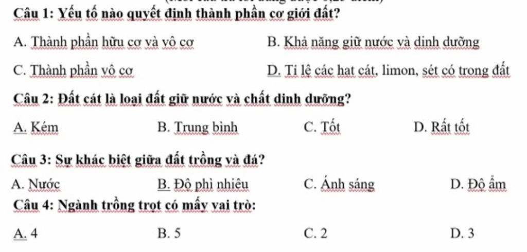 Câu 1: Yếu tố nào quyết định thành phần cơ giới đất?