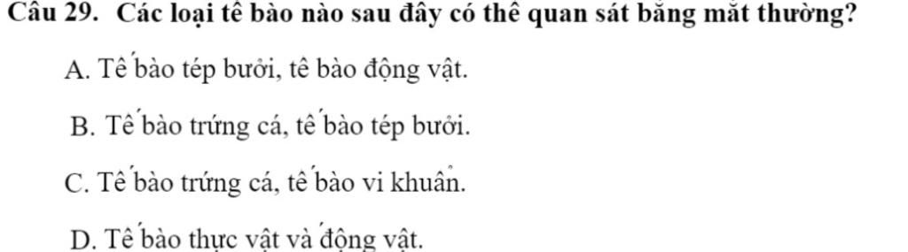 Vì tế bào trứng cà và tế bào tép bưởi to nên có thể nhìn thấy bằng mắt thường , còn các tế bào còn lại thì rất nhỏ không thể nào quan sát được bằng mắt thường .