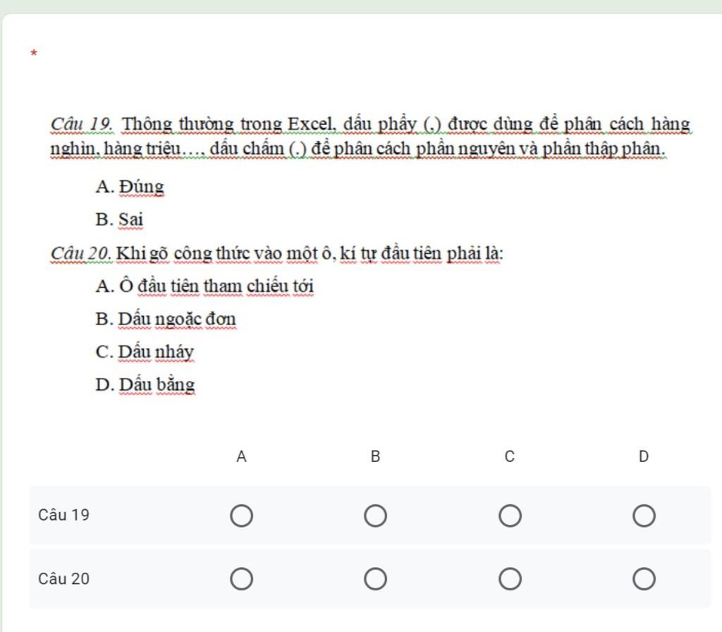 Câu `20`: Đáp án: `D`. Dấu bằng