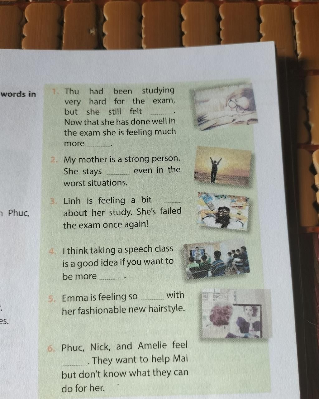 3.Linh is feeling a bit __depressed/frustrated____ about her study. She's failed the exam once again!