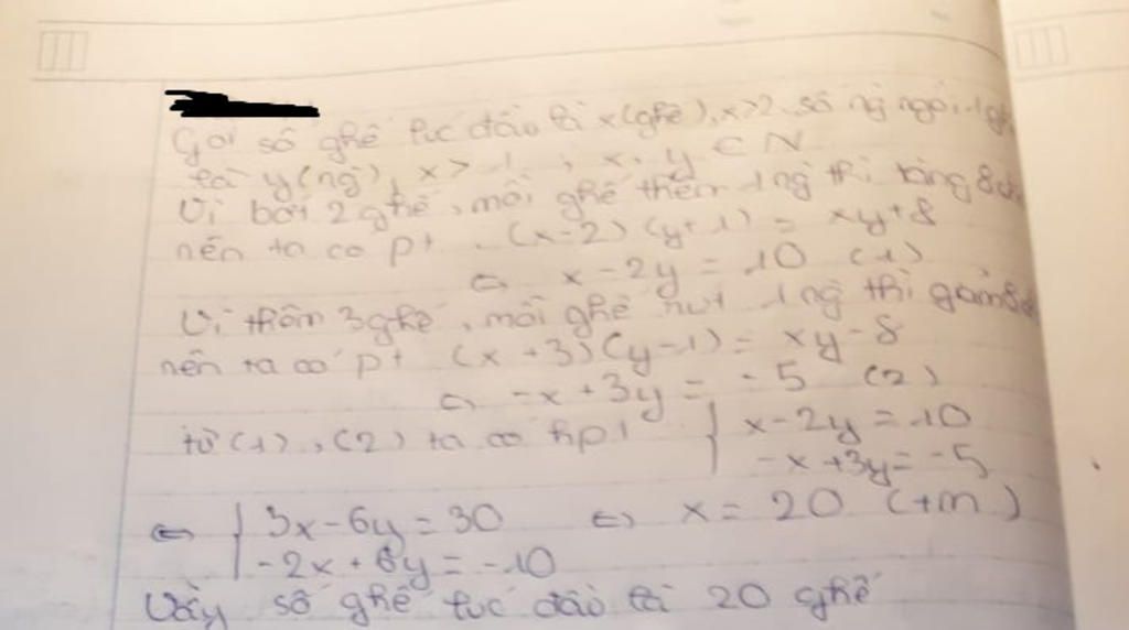 Thêm 8 chỗ so với lúc đầu ⇒ (x - 2)(y + 1) = xy + 8