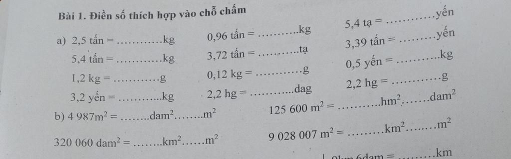 a} 2,5 tấn = 2500kg 0,96 tấn = 960kg 5,4 tạ = 54 yến