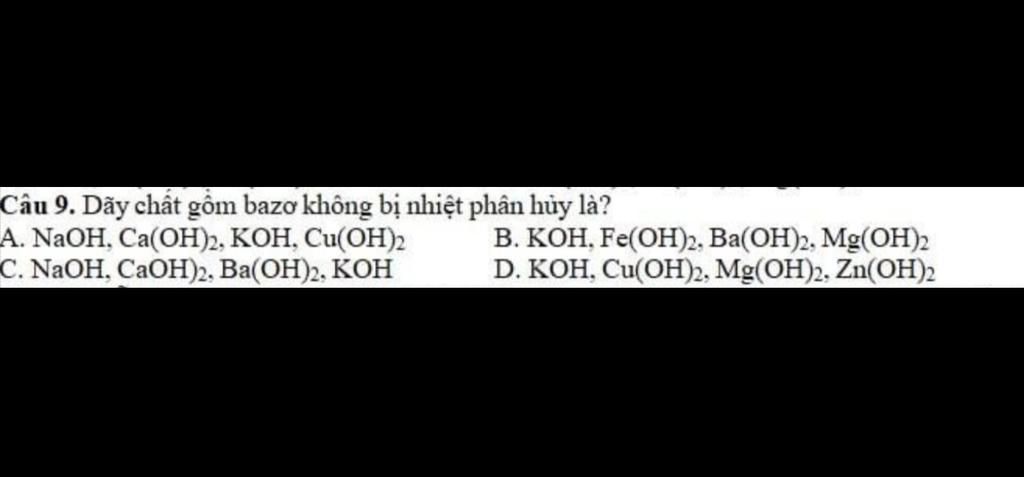 Chọn C: $NaOH$, $Ca(OH)_2$, $Ba(OH)_2$, $KOH$