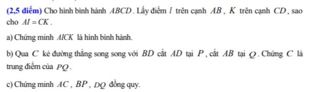 (2,5 điểm) Cho hình bình hành ABCD. Lấy điểm I trên cạnh AB, K trên cạnh CD, sao