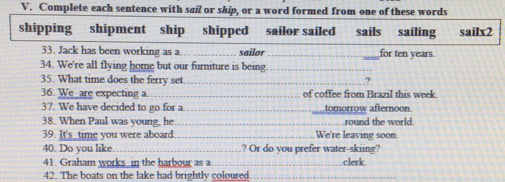 V. Complete each sentence with sail or ship, or a word formed from one of these words