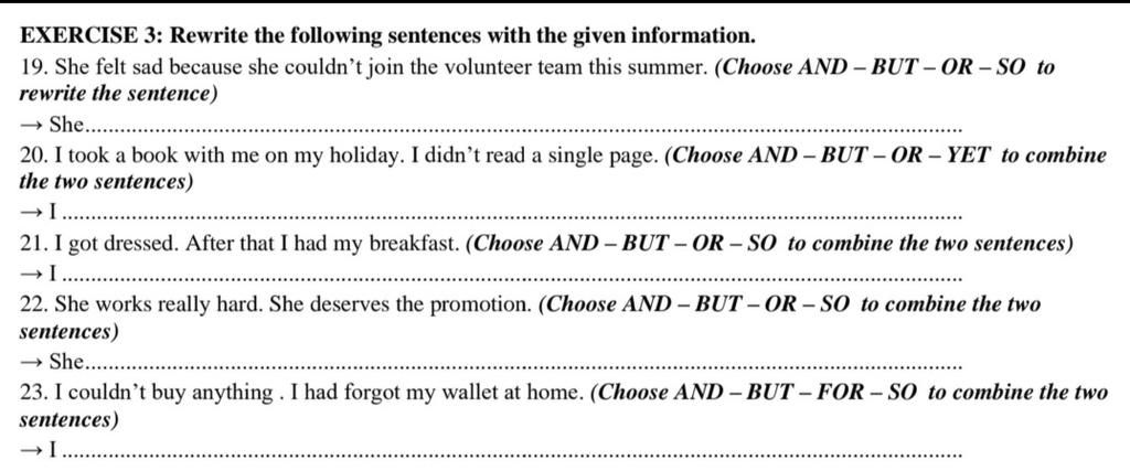 19. She felt sad because she couldn't join the volunteer team this summer. (Choose AND – BUT – OR – SO to
