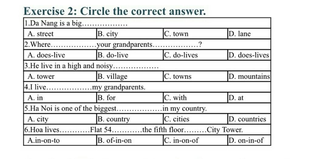 => Chọn B. Do - live vì ''grandparents'' là ông bà (là số nhiều), nên phải là ''Do''. Trong câu hỏi thì không được phép thêm đuôi '' es'' hoặc ''s''.