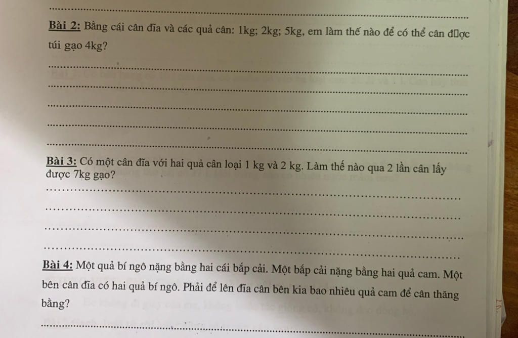 bài 2: đặt lên một đĩa cân một quả cân 5 kg, còn bên dĩa còn lại đặt quả cân 1kg,sau đó đổ gạo vào bên quả cân 1kg cho đến khi hai đĩa cân bằng, ta được túi gạo 4kg.