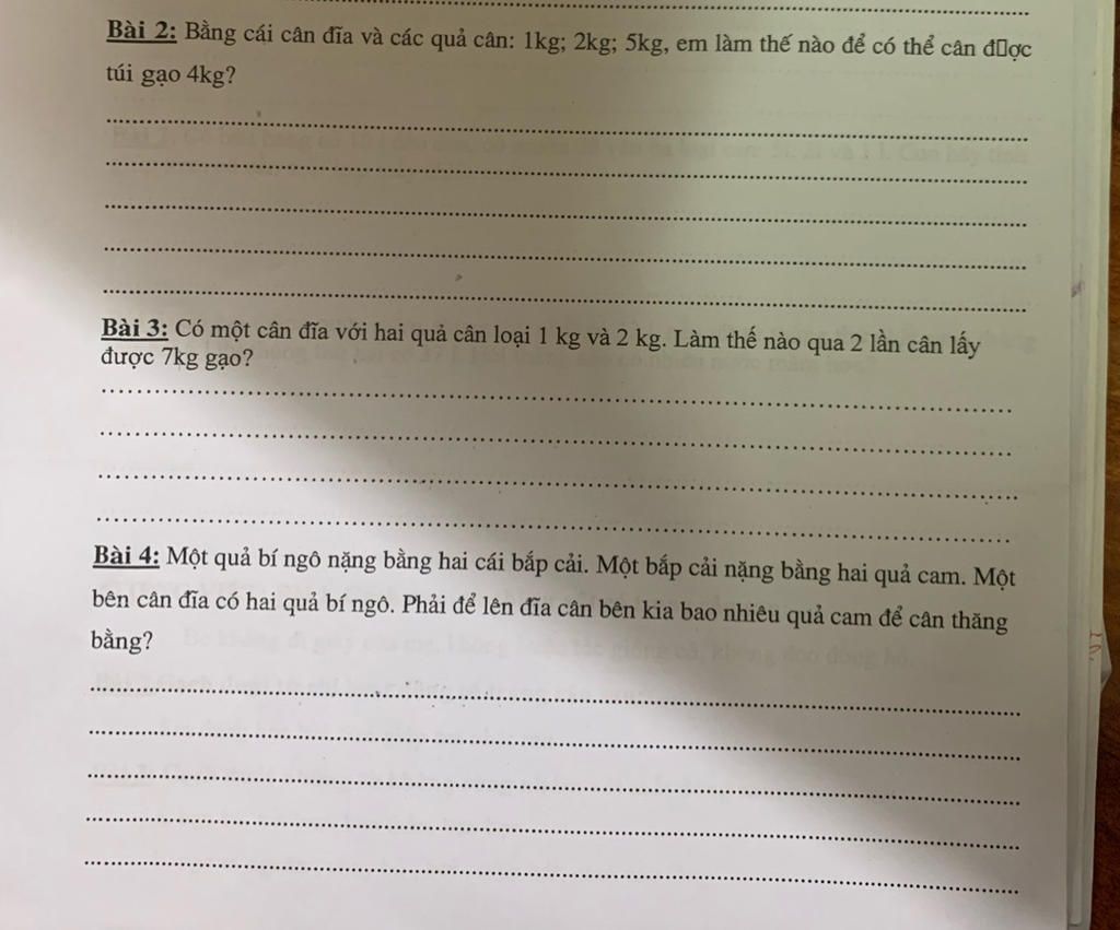 bài 2: đặt lên một đĩa cân một quả cân 5 kg, còn bên dĩa còn lại đặt quả cân 1kg,sau đó đổ gạo vào bên quả cân 1kg cho đến khi hai đĩa cân bằng, ta được túi gạo 4kg.