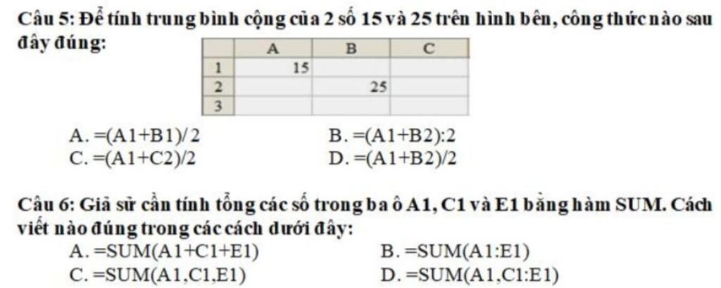 Câu 5: Để tính trung bình cộng của 2 số 15 và 25 trên hình bên, công thức nào sau