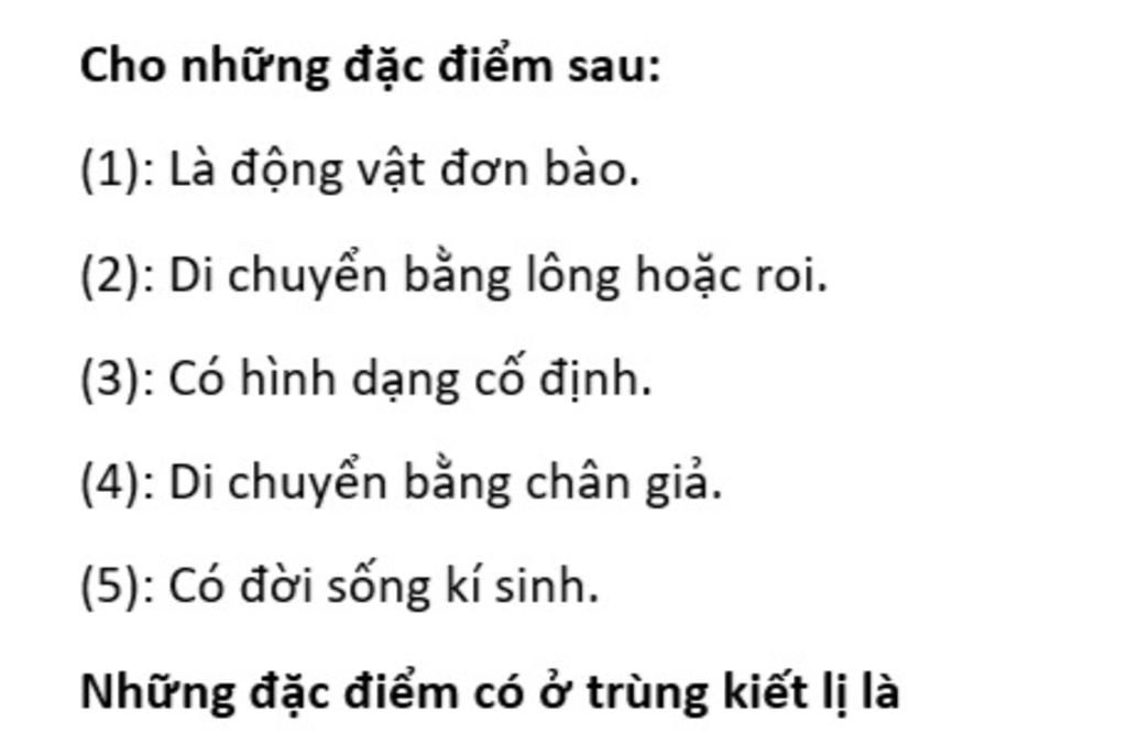 Caau 1: Đặc điểm nào có ở cả trùng giày, trùng roi và trùng biến hình? *