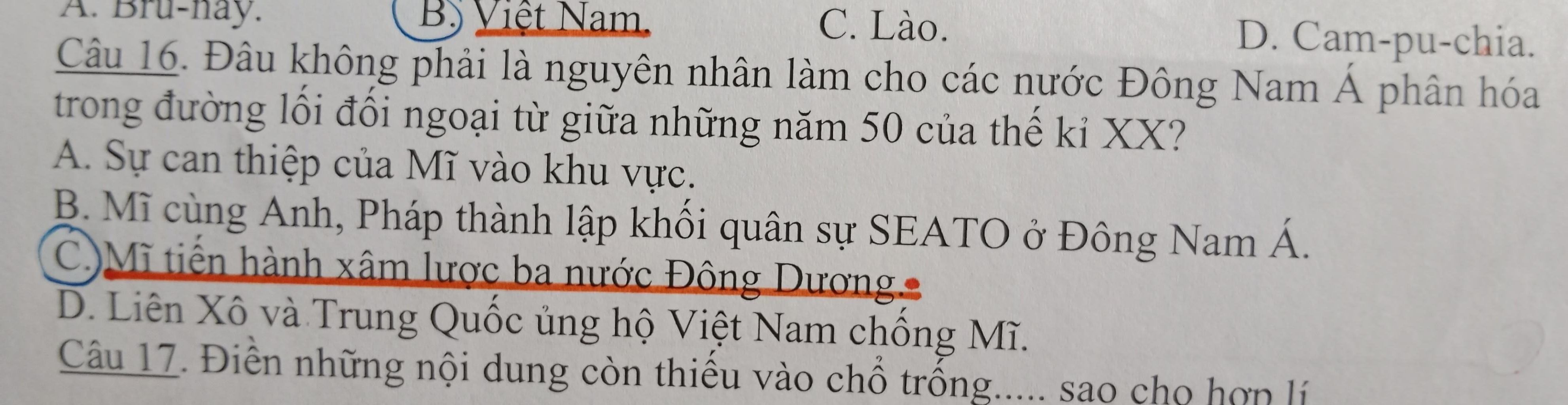 Câu 16. Đầu không phải là nguyên nhân làm cho các nước Đông Nam A phân hóa