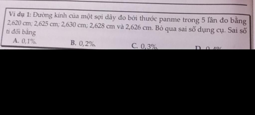\Rightarrow \delta = \dfrac{{\overline {\Delta d} }}{{\overline d }}.100\% = \dfrac{{0,003}}{{2,626}}.100\% = 0,114\%
