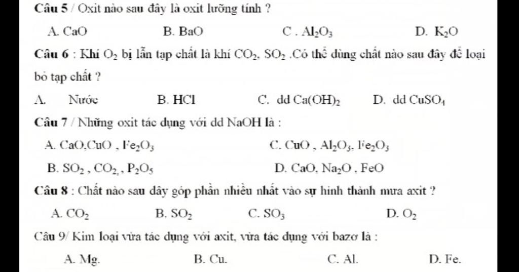 Câu 5/ Oxit nào sau đây là oxit lưỡng tính ?