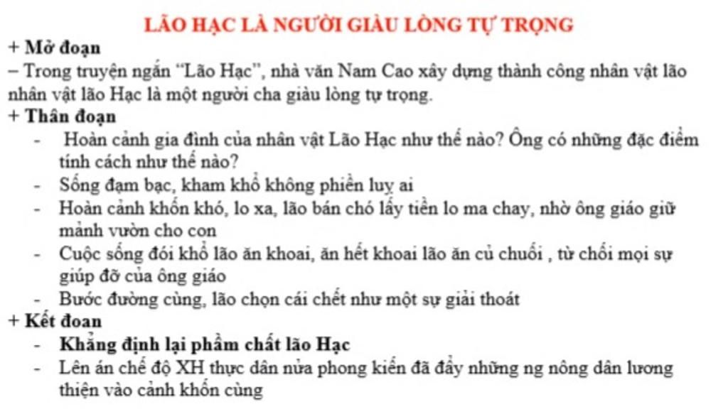 Lão Hạc là một nhân vật thành công mà Nam Cao đã xây dựng lên. Cuộc đời bi thảm của lão Hạc đã để lại trong lòng người đọc ấn tượng sâu sắc khó quên. Lão có một người vợ và một người con trai độc nhất. Vợ lão mất sớm, do không đủ tiền cưới vợ, con trai lão phẫn trí bỏ đi phu đồn điền cao su. Trước khi đi lão được người con trai trao lại một kỉ vật là một con chó vàng nên lão rất yêu thương và đặt cho nó một cái tên hay Cậu Vàng. Năm ấy do đói kém mất mùa, bão lũ cướp hết toàn bộ số hoa màu của lão và lão còn bị một trận ốm nặng. Cuộc đời đau khổ dồn ép lão đến bên bờ vực thẳm, không còn cách nào khác, lão đành phải đứt ruột mà bán đi con chó Vàng lão hằng yêu thương; để rồi khi bán xong, lão lại hu hu khóc như con nít. Sợ sống mà ảnh hưởng tới con trai, vì đã trót lòng lừa gạt một con chó, lão quyết định chết bằng bả chó và lão "đi đời" trong đau khổ và tủi nhục. Cái chết của lão cũng chính là sự tự trọng của lão với con lão. Lão Hạc có một tấm lòng thật đáng.