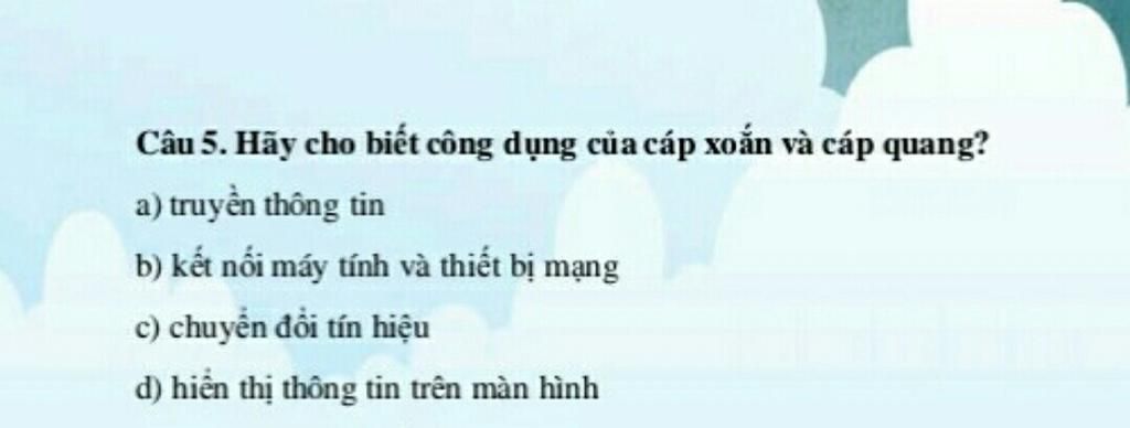 Giải thích:Cáp xoắn đôi và cáp quang được sử dụng để truyền tải thông tin và kết nối máy tính và các thiết bị mạng.
