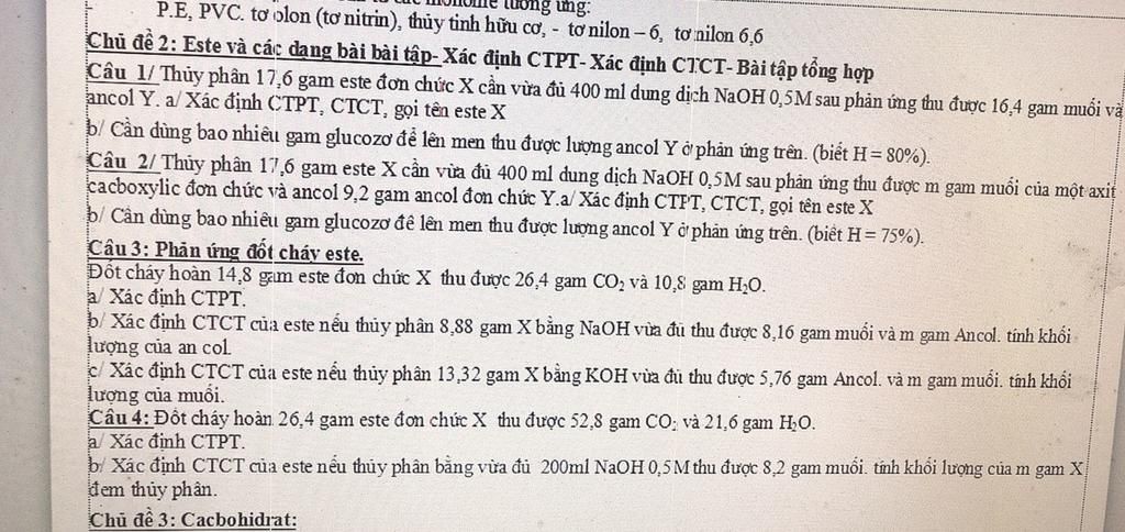 Câu 1/ Thủy phân 17,6 gam este đơn chức X cần vừa đủ 400 ml dung dịch NAOH 0,5M sau phản ứng thu được 16,4 gam muối và