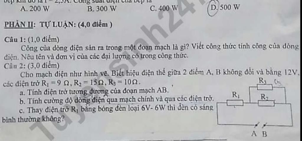 Cho mạch dien như hình vẽ. Biết hiệu điện thế giữa 2 diểm A, B không doi và bằng 12V