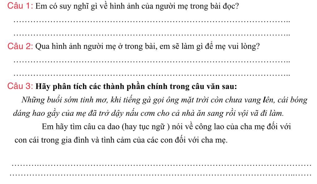 Câu 2: Mẹ rất vất vả , bởi vậy ta hãy luôn yêu quý , kính trọng mẹ, đồng thời phải học tập thật tốt để mẹ vui lòng.