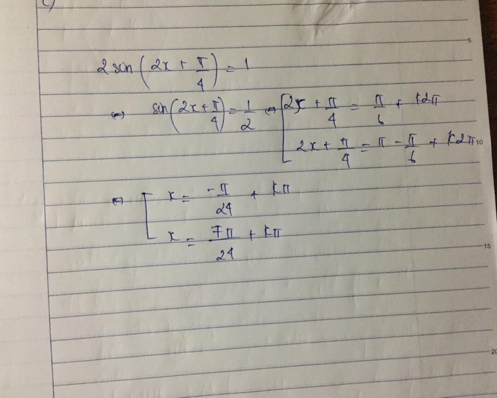 `⇔ sin\ (2x+\frac{\pi}{4})=sin\ \frac{\pi}{6}`