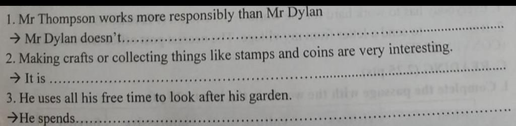 1. Mr.Dylan doesn't work as responsibly as Mr.Thompson. ( Dạng so sánh ngang bằng của trạng từ.) 2. It is very interesting to make crafts or collect things like stamps and coins. ( It is +Adj+ to V: Nó như thế nào để làm gì) 3. He spends all his free time looking after his garden. ( S+ spend+ thời gian+ V-ing....: Ai đó dành/mất bao nhiêu thời gian làm việc gì)