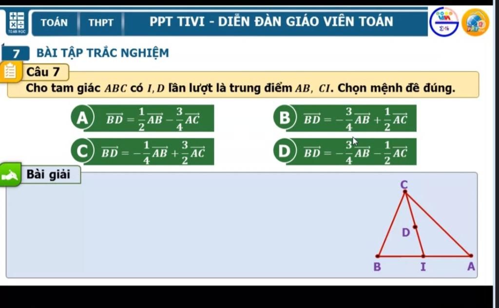 Vậy `\vec{BD}=-3/ 4 \vec{AB}+1/ 2 \vec{AC}`