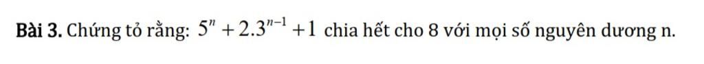 $\begin{array}{l} {5^{k + 1}} + {2.3^k} + 1\\ = {5.5^k} + {2.3.3^{k - 1}} + 1\\ = 5\left( {{5^k} + {{2.3}^{k - 1}} + 1} \right) - 4\left( {{3^{k - 1}} + 1} \right)\\ + 5\left( {{5^k} + {{2.3}^{k - 1}} + 1} \right) \vdots 8\left( {\text{Giả thiết quy nạp}} \right)\\ + {3^{k - 1}} + 1 \vdots 2 \Rightarrow 4\left( {{3^{k - 1}} + 1} \right) \vdots 8\\ \Rightarrow {5^{k + 1}} + {2.3^k} + 1 \vdots 8 \end{array}$
