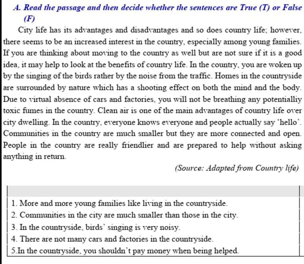 City life has its advantages and disadvantages and so does country life;however, there seems to be an increased interest in the country, especially among young families (1) If you are thinking about moving to the country as well but are not sure if it is a good idea, it may help to look at the benefits of country life. In the country, you are woken up by the singing of the birds rather by the noise from the traffic (3). Homes in the countryside are surrounded by nature which has a shooting effect on both the mind and the body. Due to virtual absence of cars and factories, you will not be breathing any potentialliy toxic fumes in the country (4). Clean air is one of the main advantages of country life over city dwelling. In the country, everyone knows everyone and people actually say "hello". Communities in the country are much smaller but they are more connected and open (2). People in the country are really friendlier and are prepared to help without asking anything in return. (5)