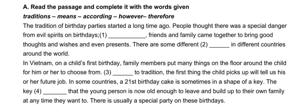 In Vietnam, on a child’s first birthday, family members put many things on the floor around the child for him or her to choose. (3) __according____ to tradition, the first thing the child picks up will tell us his or her future job. In some countries, a 21st birthday cake is sometimes in a shape of a key. The key (4) __means_____ that the young person is now old enough to leave and build up to their own family at any time they want to. There is usually a special party on these birthdays.