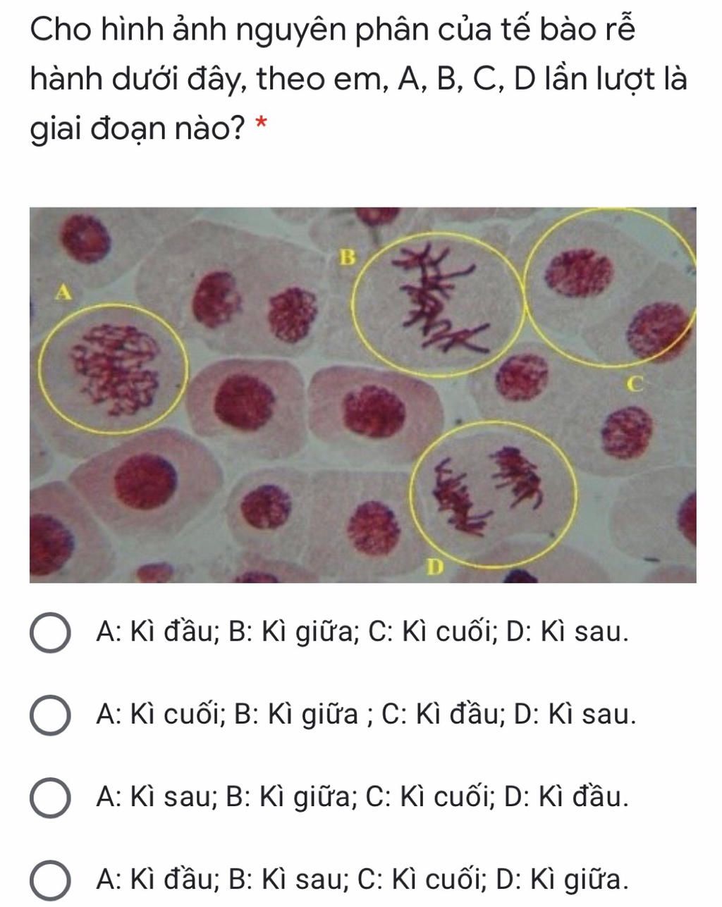 `A.` Kì đầu, kì giữa, kì cuối, kì sau.