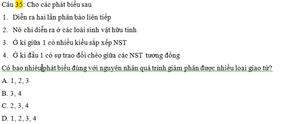 4 đúng: 1 tế bào sinh tinh giảm phân xảy ra trao đổi chéo cho 4 loại giao tử thay vì 2 loại giao tử