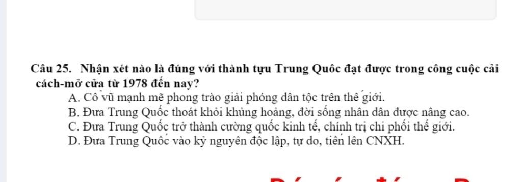 Nhận xét nào là đúng với thành tựu Trung Quốc đã đạt được trong công cuộc cải cách - mở cửa từ năm 1978 đến nay?